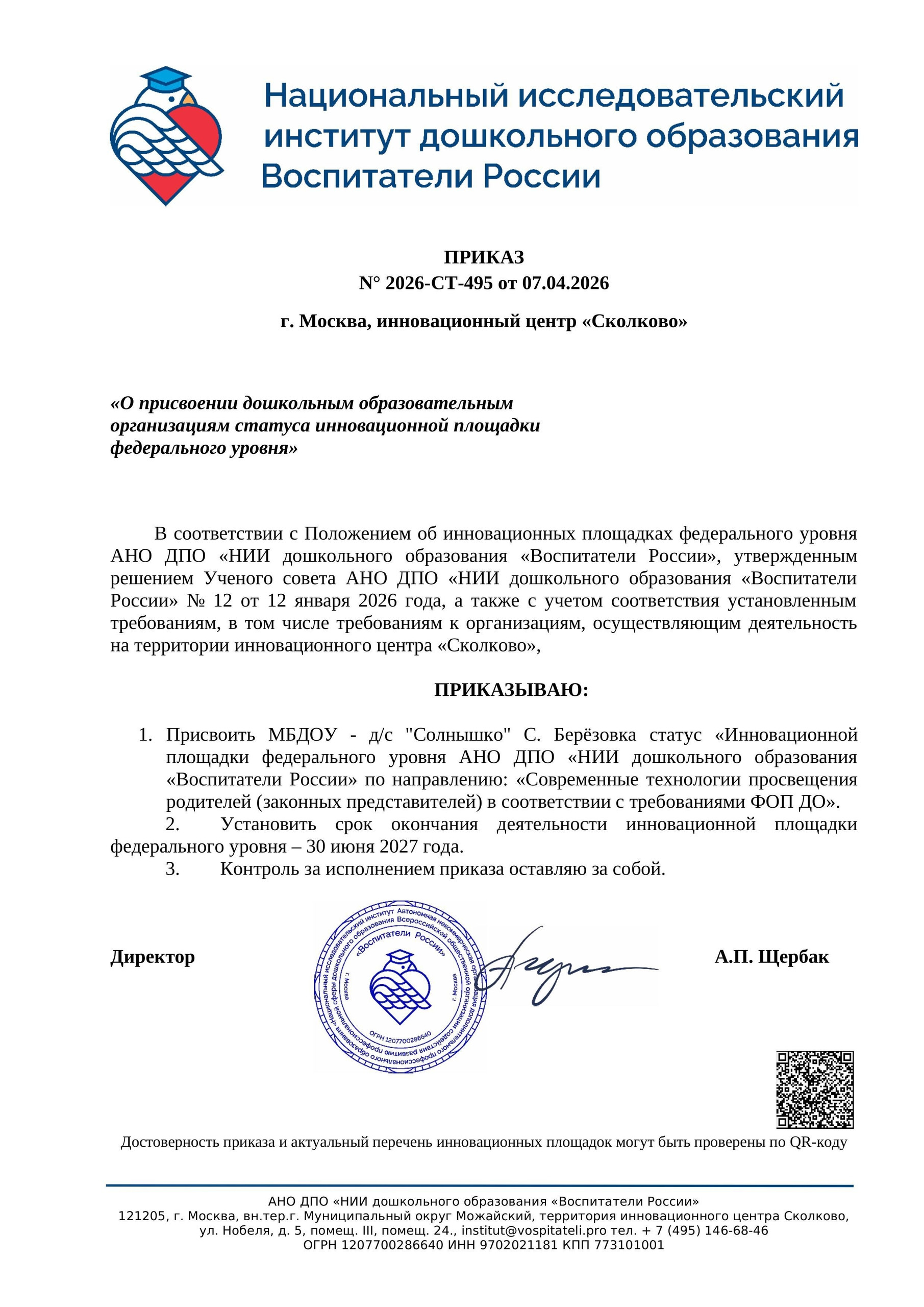 7 апреля 2026 года МБДОУ- д/с «Солнышко» с.Берёзовка присвоен статус «Инновационной площадки федерального уровня АНО ДПО «НИИ дошкольного образования «Воспитатели России»!