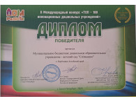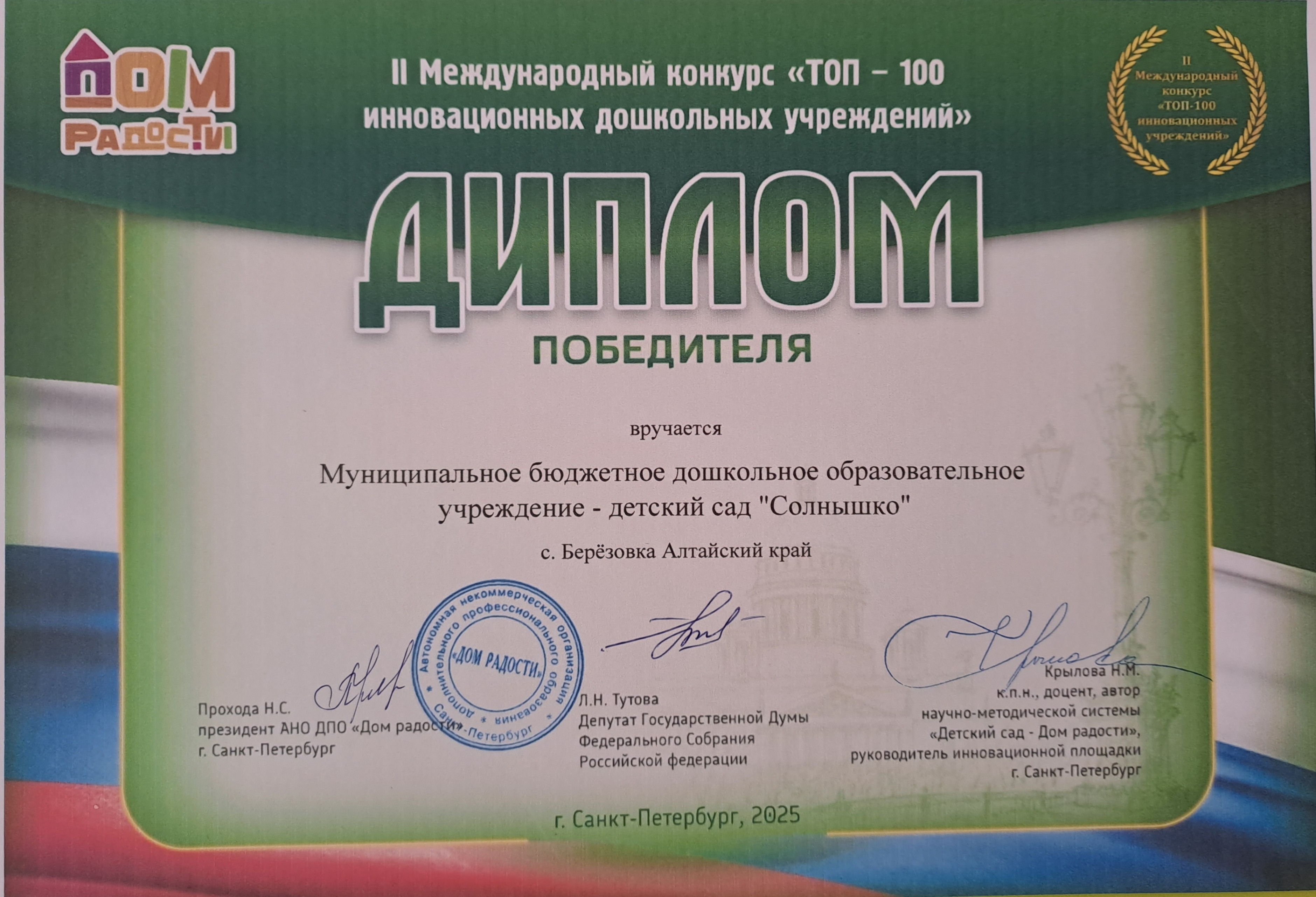 МБДОУ д/с «Солнышко» стал победителем II Международного конкурса «ТОП-100 инновационных дошкольных учреждений»