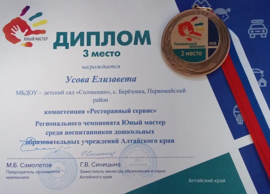 Воспитанница МБДОУ -детский сад "Солнышко" с.Берёзовка Усова Елизавета под руководством наставника, молодого специалиста Горбачевой Л.С. показала достойные результаты в компетенции «Ресторанный сервис».