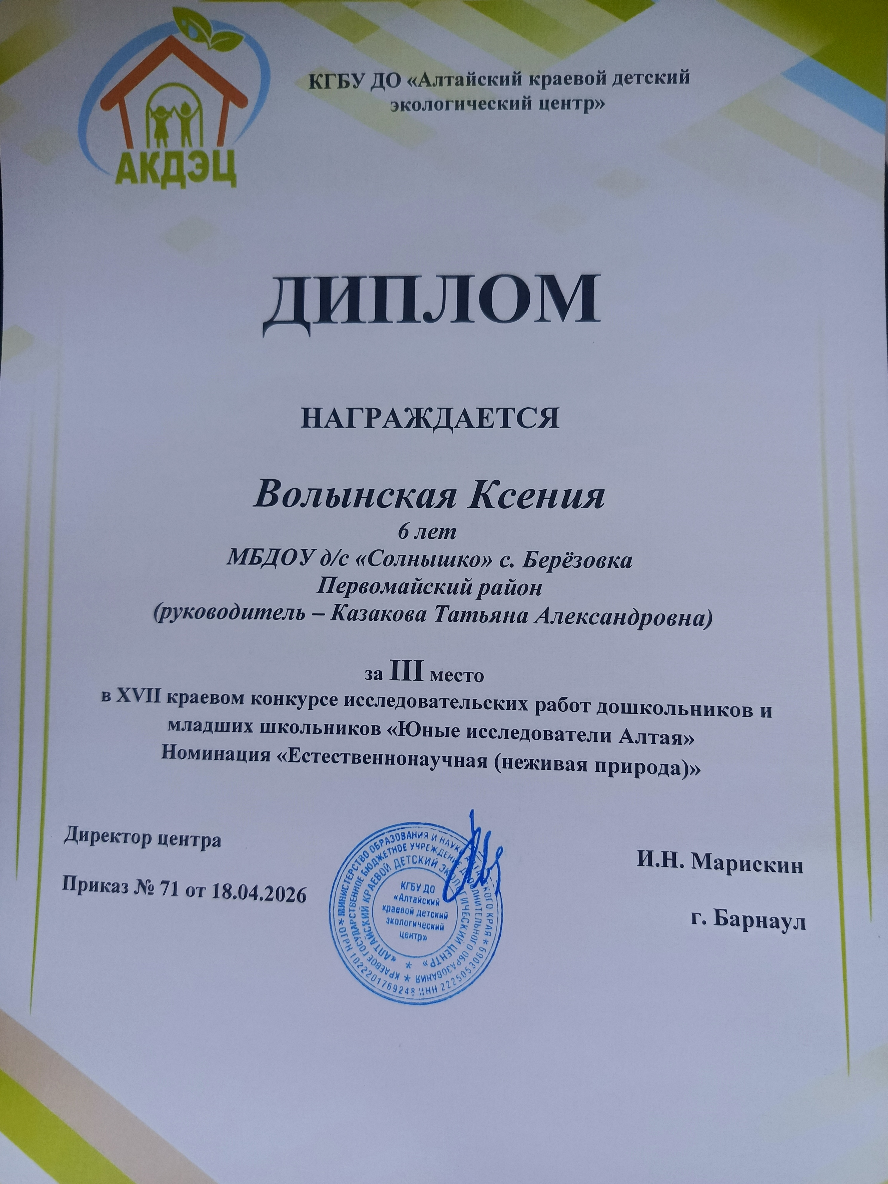 Воспитанница МБДОУ — детский сад «Солнышко» с.Берёзовка Волынская Ксения стала победителем (3 место) в XVII краевом конкурсе исследовательских работ дошкольников и младших школьников "Юные исследователи Алтая".